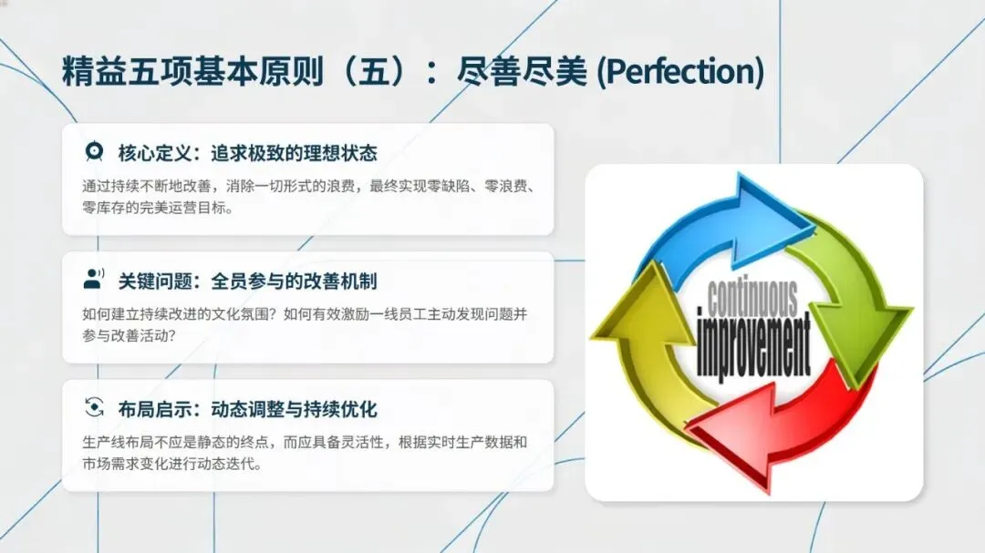 精益布局的本质并非简单的设备物理排列,而是设计价值的顺畅流动路径,布局模式选择需因地制宜,匹配产品特性与市场需求。唯有以数据为驱动,建立持续改进的文化氛围,才能实现物流、信息流、价值流、人流、空间流的完美统一,让精益布局的价值持续释放。