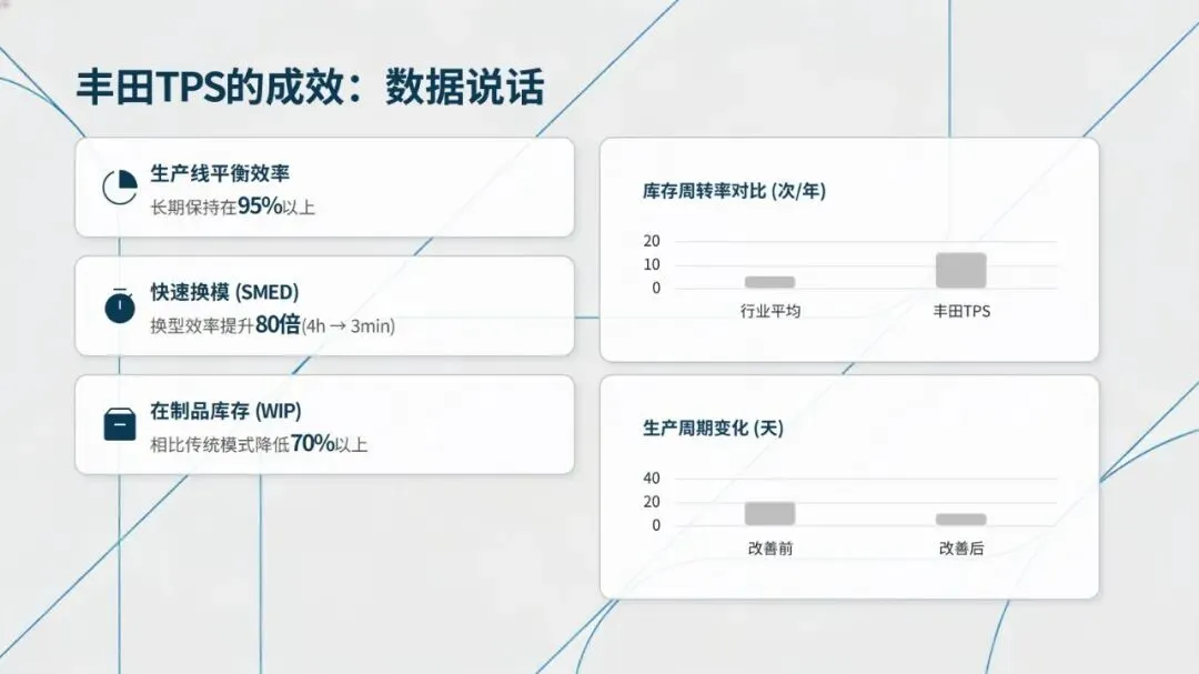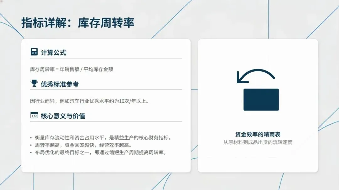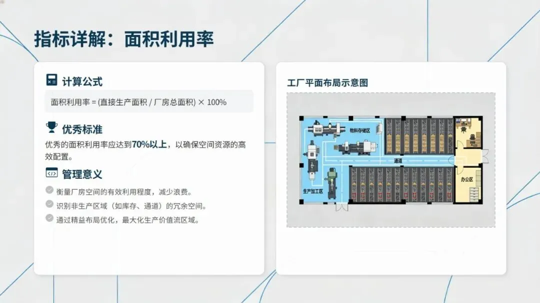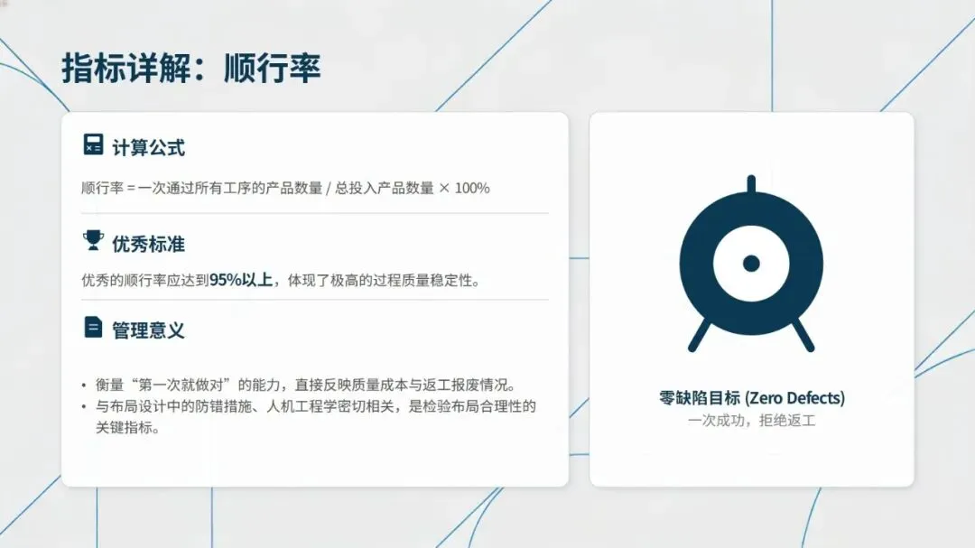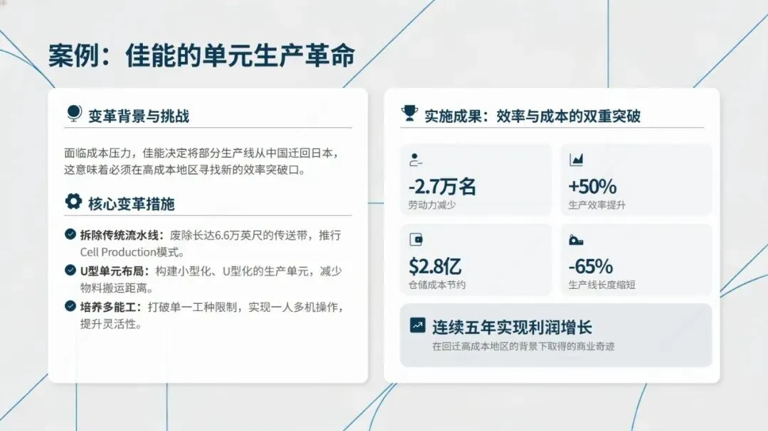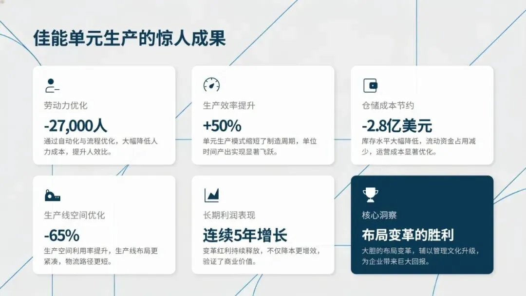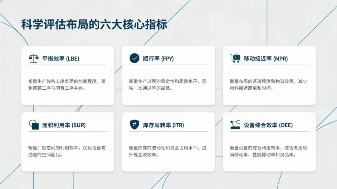 丰田TPS、特斯拉超级工厂、海尔互联工厂、佳能单元生产革命等标杆案例,从不同维度印证了精益布局的实践价值,无论是丰田的U型单元与快速换模,还是佳能拆除流水线推行U型单元生产,均实现了生产效率提升、库存成本降低的显著成效。同时,建立平衡效率、顺行率、移动接近率等六大核心量化指标,能科学衡量布局优劣,为优化提供数据支撑。