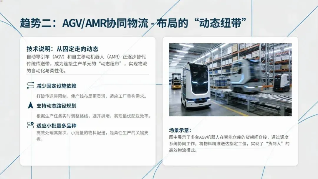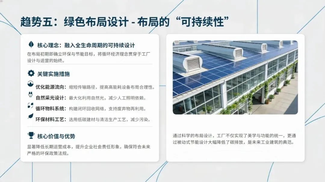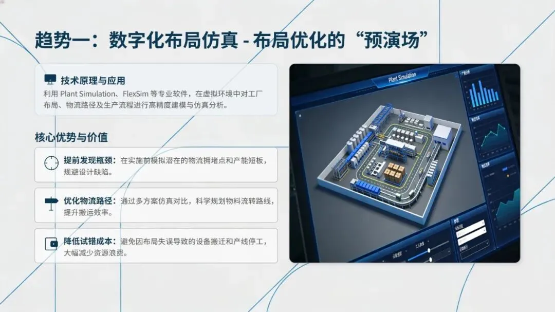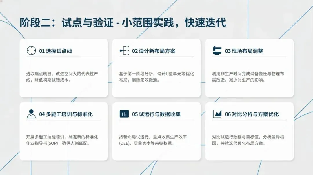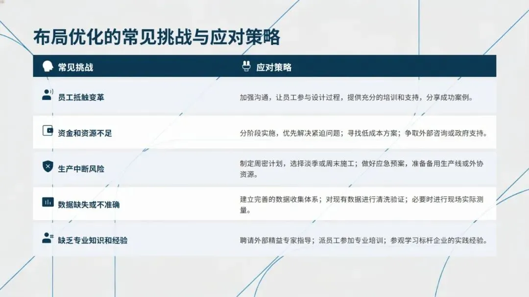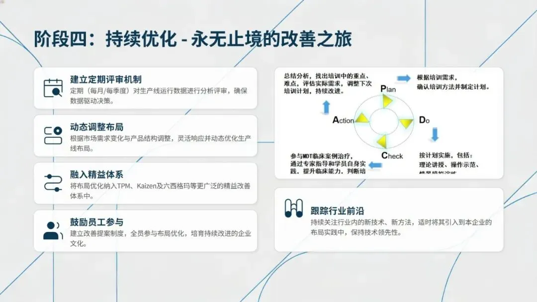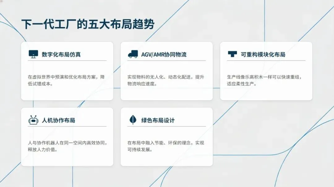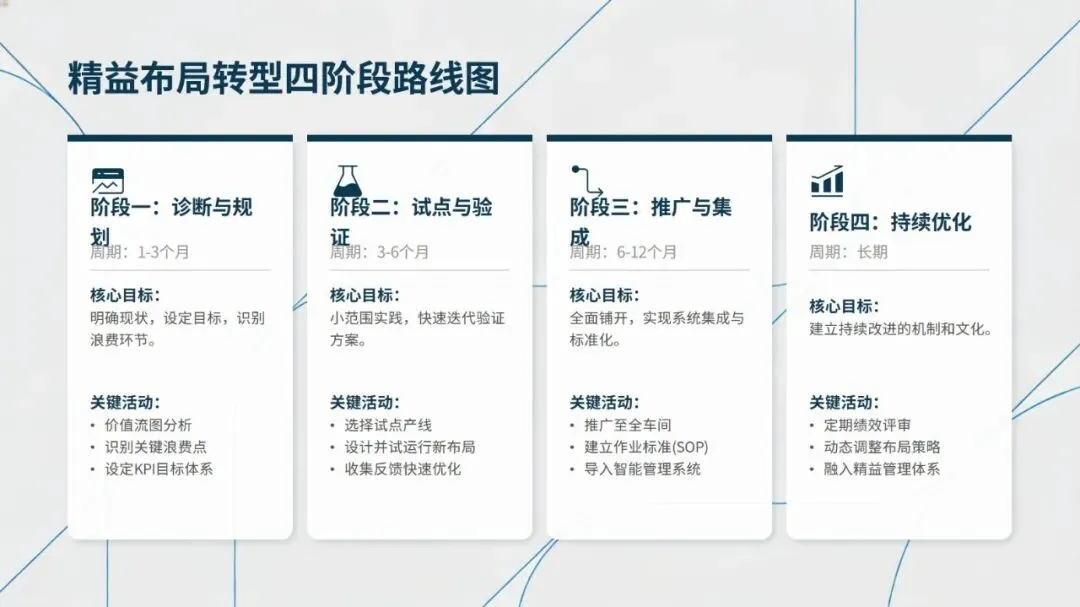 未来精益布局紧扣工业4.0发展趋势,呈现数字化布局仿真、AGV/AMR协同物流、可重构模块化布局、人机协作布局、绿色布局设计五大方向,通过数字化、智能化技术提升布局的柔性与可持续性。从传统布局向精益布局转型,可遵循诊断与规划、试点与验证、推广与集成、持续优化的四阶段路线,同时需把握高层领导支持、跨职能团队协作、员工充分参与等关键成功因素。