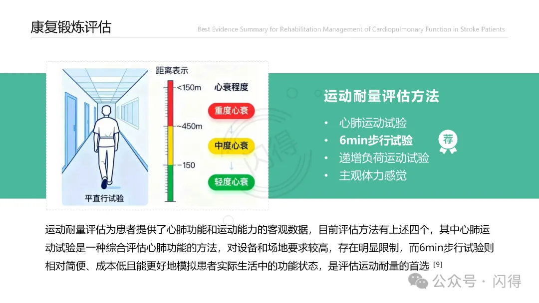 康复评估:涵盖体格检查(心功能、肺活量等)、康复意愿、运动耐量(首选6分钟步行试验)及心理状态。