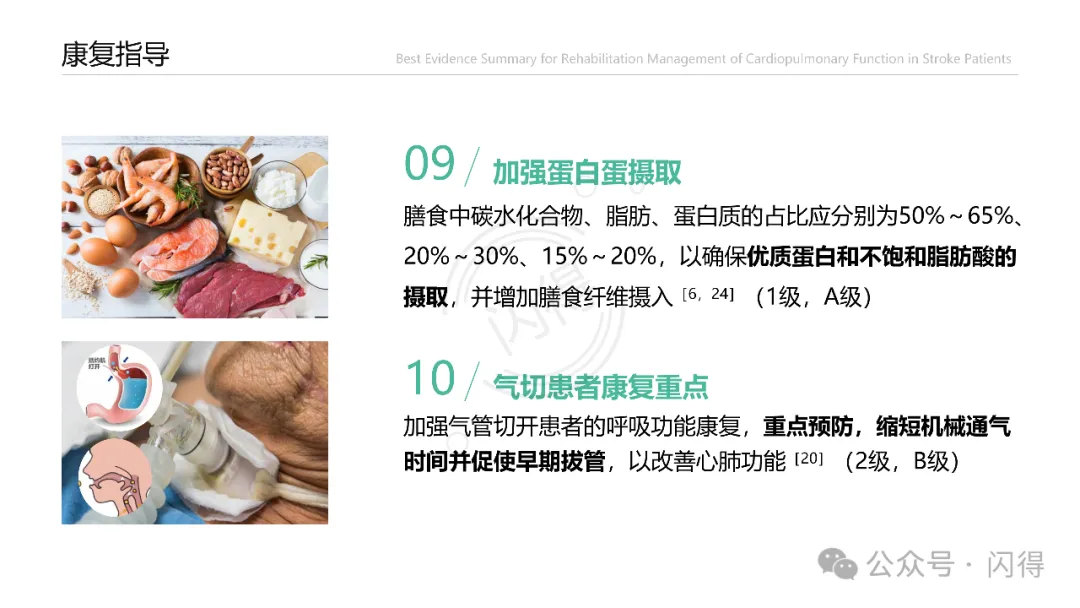 康复指导:膳食推荐碳水50%~65%、脂肪20%~30%、蛋白质15%~20%;气管切开患者需预防误吸,吞咽障碍者尽早鼻饲及吞咽训练;可通过微信平台等互联网工具远程指导。