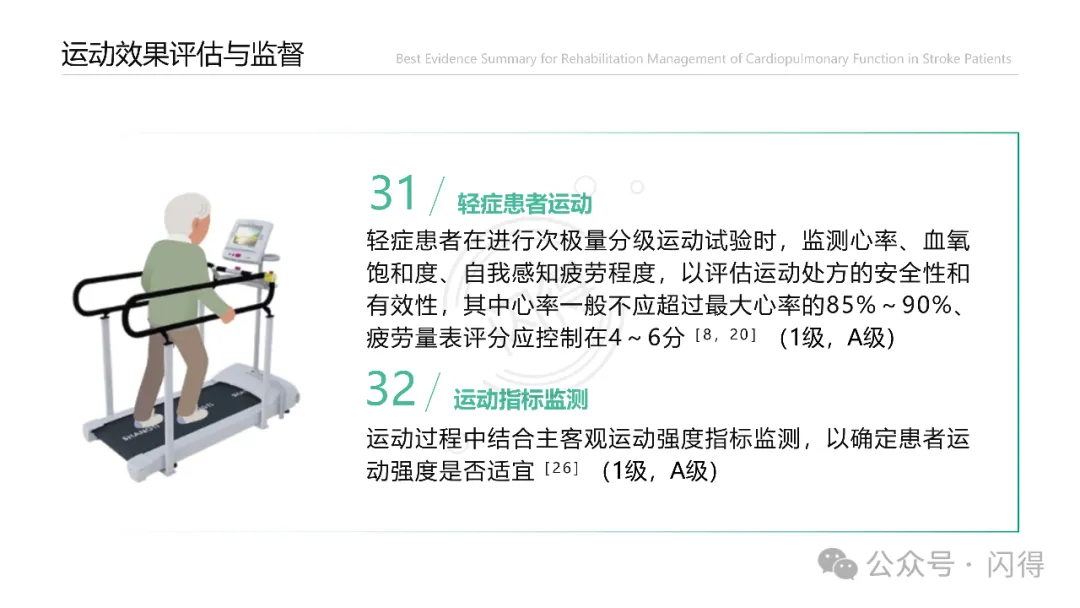 效果监督:监测峰值摄氧量、6分钟步行距离等,轻症患者运动时控制心率<最大心率85%~90%。