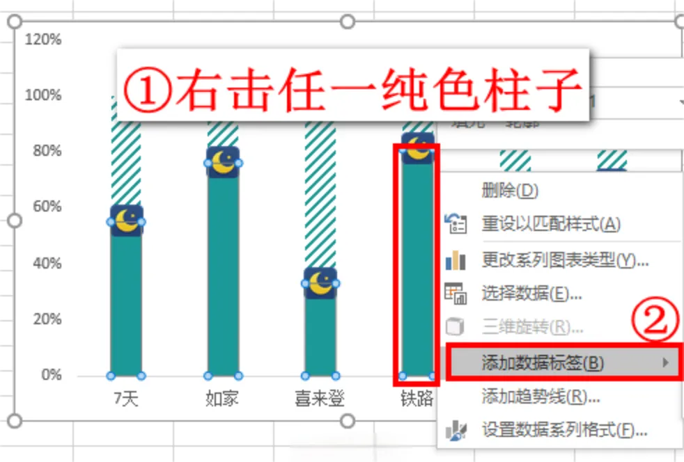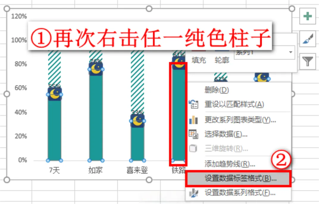 这时月亮图标上方已经出现了数据标签,为了方便观看,我们需要改变数据标签的位置。再次选中任一纯色的柱子,单击鼠标右键,这次选择设置数据标签格式。如下图: