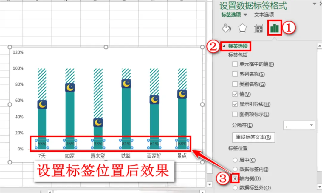 右侧弹出的设置数据标签格式窗格,选择第4个小图标,在标签选项中,选择“标签位置”为轴内侧。如下图: