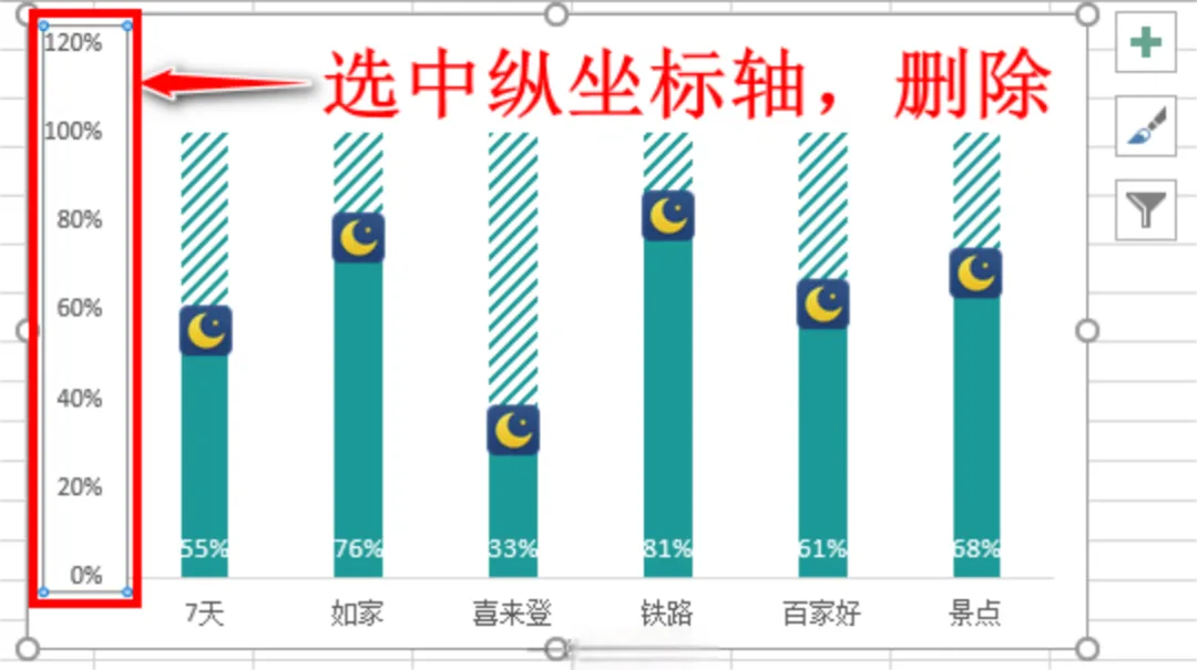 另外,由于我们已经将每个柱子设置了数据标签,所以左侧纵坐标轴显得有些多余,因此我们选中左侧纵坐标轴,按键盘Delete完成删除: