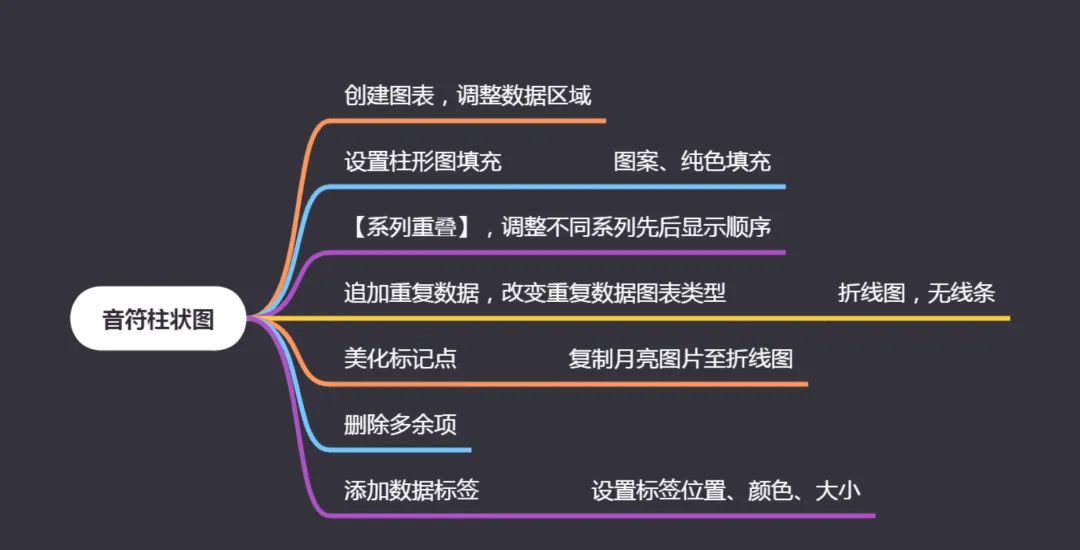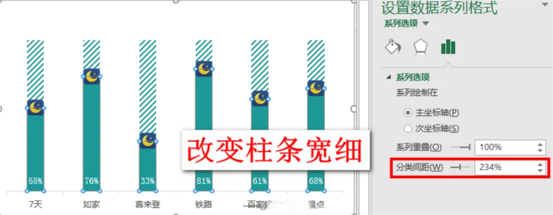 最后,如果你感觉柱条比较细,还可以通过我们学过的功能——分类间距(部分版本也叫间隙宽度)适当调整柱条宽度,使柱条的宽度与月亮图标的宽度更统一。如下图: