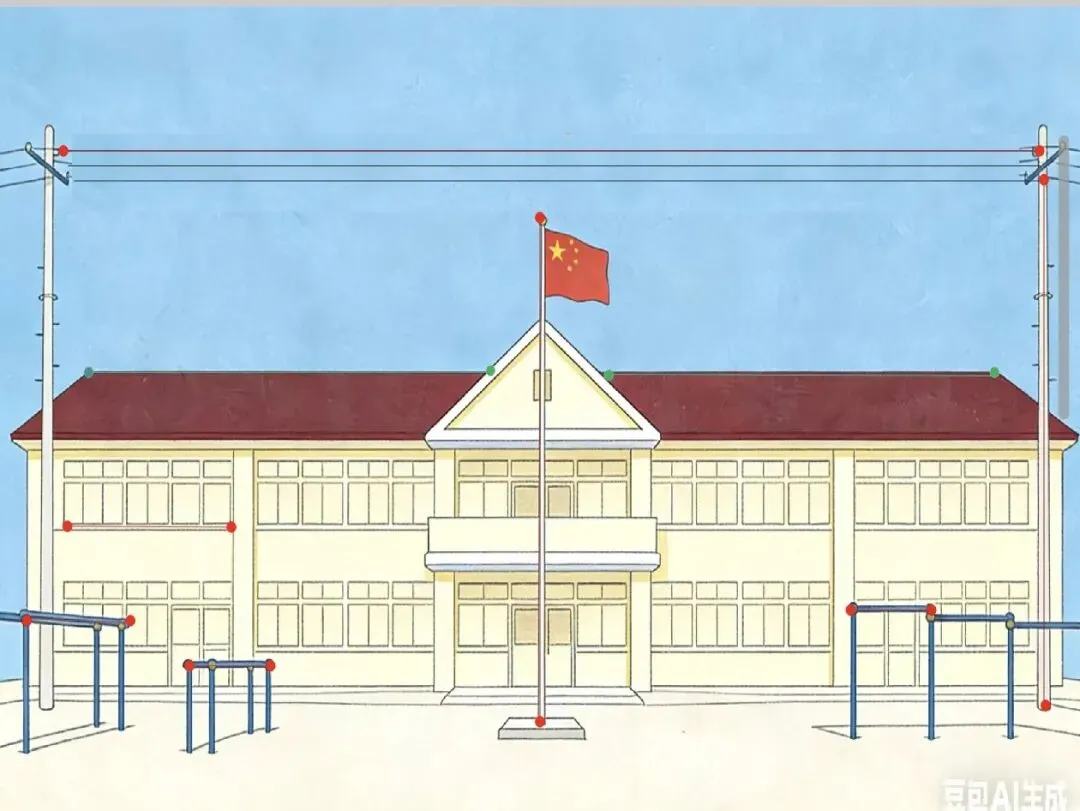 现在请同学们观察一下,在这幅图片上你看到了线段了吗?(电线上、单杠、双杠上,房屋、窗户、旗杆上面都有线段),现在我们把画面去掉,把我们找到的线段留下,请你观察,这些线段有什么特点?