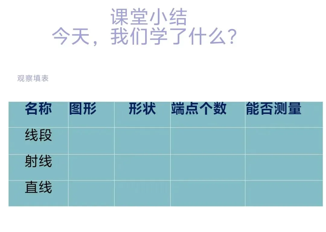 学生观察后回答:都有两个端点(板书)形状都是直直的(板书)这些线段还有什么特点?这些线段有的长,有的短,我们可以量出这些线段的长度吗?可以测量出长度。(板书)