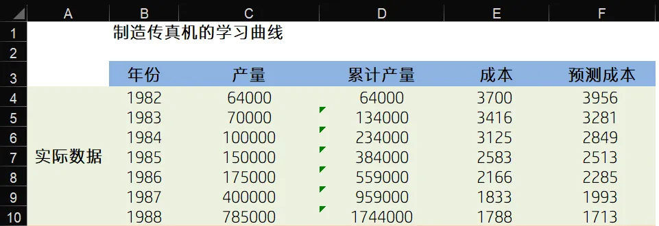 如上图,我们收集了传真机公司1982年-1988年间的实际产量(C列)以及每年的单台生产成本