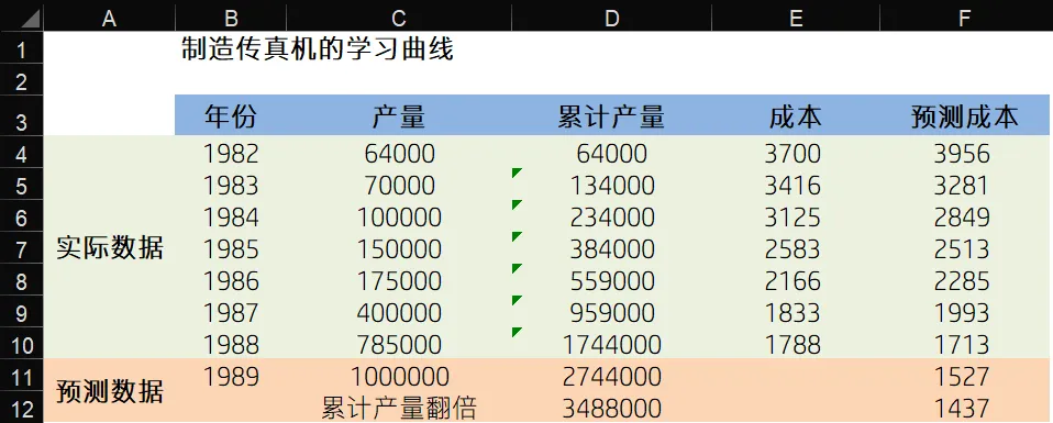由于我们采集的实际数据只到1988年,所以我们对1989年的情况进行预测,我们假设1989年生产了 1,000,000 台传真机,在 D11 单元格计算出 1989 年的总累计产量为2,744,000后,在F列将预测公式复制到 F11,从而预测 1989 年生产的传真机成本为 1,527元。