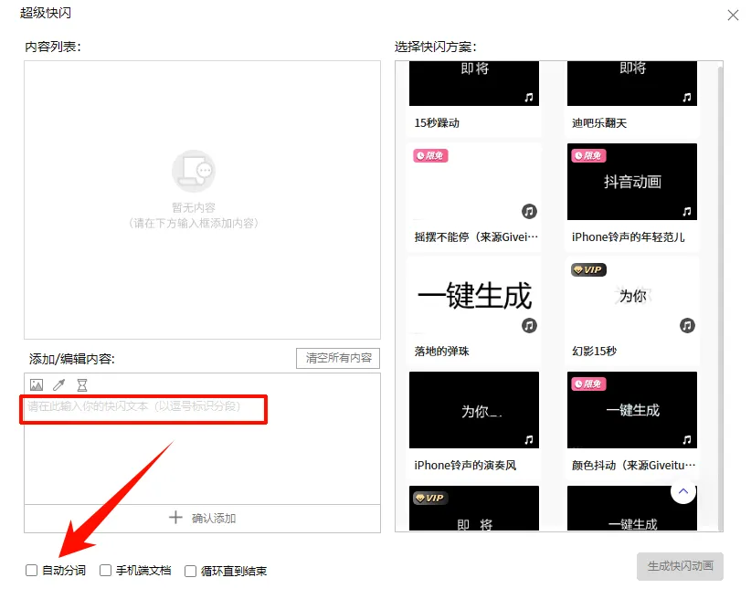 就会看到下方的制作窗口,只需准备一份自我介绍的文案,可以把每一页要出现的内容以逗号“,”进行分开,程序就会严格按照每一个逗号进行分页显示,如果我们钩选自动分词就直接把一段文本粘贴进去,程序会自动分词分页面。比如:“嘿,屏幕前的,各位,准备好,你们的,尖叫和,掌声了吗?,注意!注意!非战斗人员,请,迅速撤离!,接下来,即将,登场的是,你们的新老师!,新老师!,新老师!,没错,就是我!,别眨眼!,千万别眨眼!,倒计时,3,2,1,这里插入你的照片,这里插入你的照片,这里插入你的照片,这里插入你的照片,当当当当!,这就是我,你们,集智慧,与美貌,于一身的,语文老师,张老师!。。。。”把准备好的快闪文案(如果文案也不会写的话,可以直接丢给豆包或deepseek,然后再手动修改一下就行)复制到内容区域,然后点击确认添加,文案就会出现在上面的内容列表中。然后在右边选择一个快闪模板,有限免和没有标记VIP的都是可以使用的,最后点击生成快闪动画。根据内容的长短,大概等待一两分钟,程序就会自动给你生成一套完整的快闪PPT。