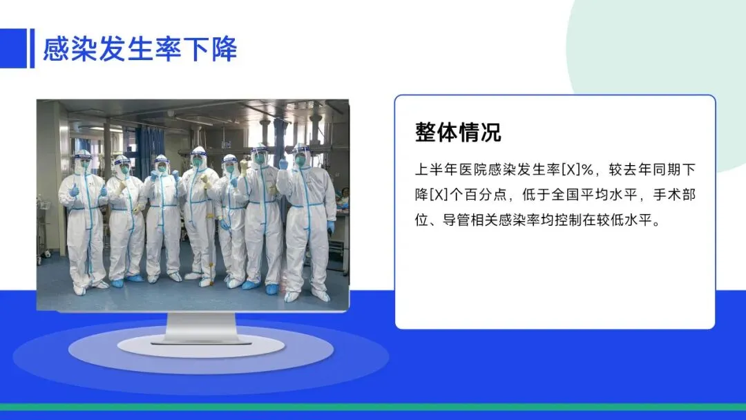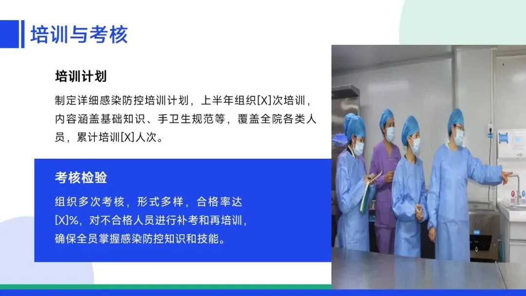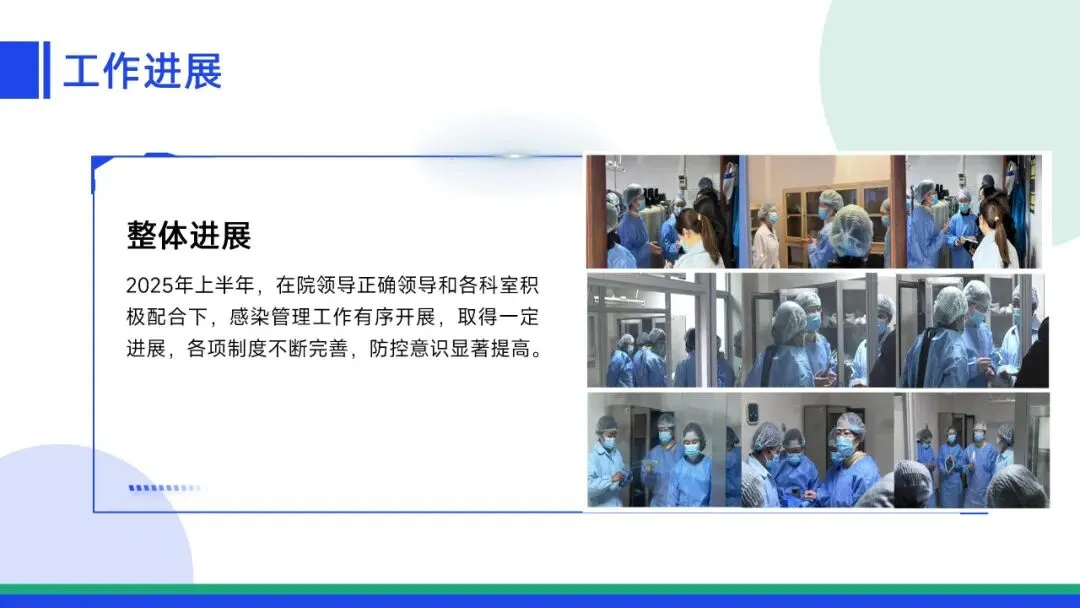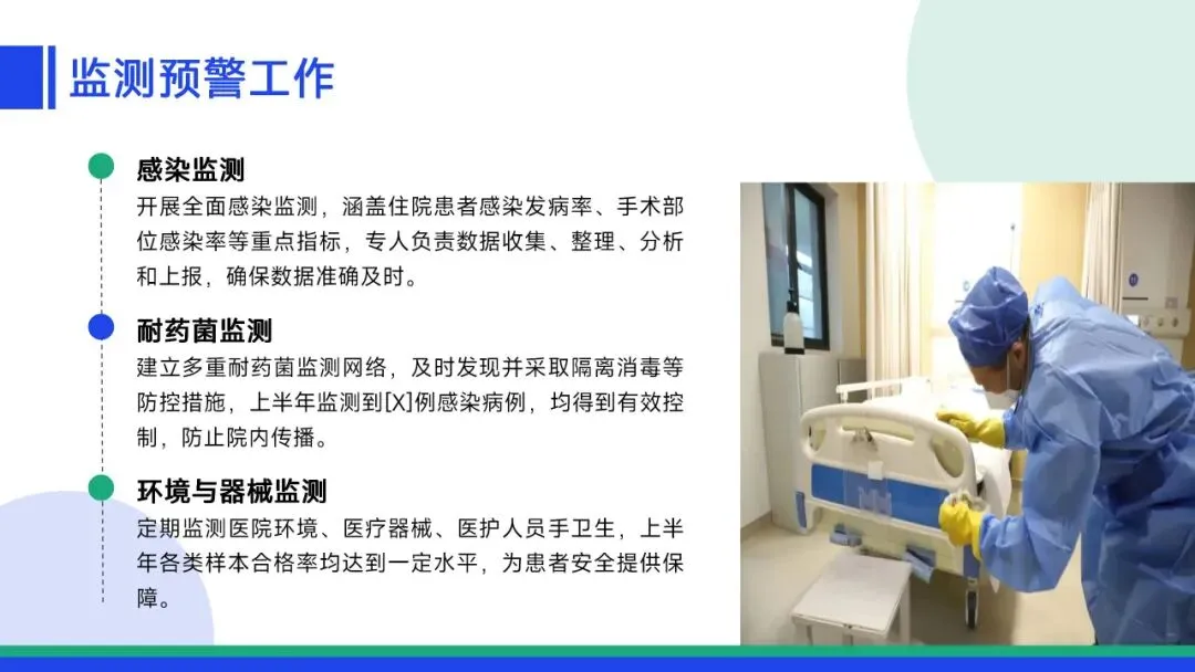 一、工作概述 2025 年上半年,我院感染管理工作在院领导的正确领导和各科室的积极配合下,严格遵循国家相关法律法规和行业规范,以降低医院感染发生率、保障患者和医护人员安全为核心目标,有序开展各项工作,整体取得了一定进展。我们始终坚持预防为主、防治结合的原则,不断完善感染管理体系,强化全员感染防控意识,努力提升医院感染管理水平。修订和完善了《医院感染管理制度汇编》,新增了《多重耐药菌感染防控流程》等 5 项制度,使感染管理工作有章可循,进一步规范了各科室的操作行为。 组织相关科室人员对现有制度进行了培训和解读,确保各科室人员能够准确理解和执行制度要求,提高制度的执行力。 开展全面的医院感染监测,包括住院患者医院感染发病率、手术部位感染率、导管相关血流感染率、导尿管相关尿路感染率等重点指标的监测。安排专人负责数据的收集、整理、分析和上报,确保数据的准确性和及时性。 加强对多重耐药菌的监测与防控,建立了多重耐药菌监测网络,及时发现多重耐药菌感染病例,并采取有效的隔离、消毒等防控措施,防止其在医院内传播。上半年共监测到多重耐药菌感染病例 00例,均得到有效控制。 对医院环境、医疗器械、医护人员手卫生等进行定期监测,上半年共监测环境样本 00 份,合格 00份,合格率为00%;监测医疗器械样本00份,合格 00份,合格率为 00%;监测医护人员手卫生样本00份,合格 00份,合格率为 00%。 制定了详细的感染防控培训计划,上半年共组织各类感染防控培训 00次,培训内容包括医院感染基础知识、手卫生规范、标准预防、消毒灭菌技术、多重耐药菌防控等。培训对象覆盖全院医护人员、实习进修人员、保洁人员等,累计培训00人次。 为检验培训效果,组织了多次感染防控知识考核,考核形式包括笔试、现场操作等。考核合格率达到00%,对于考核不合格的人员,进行了补考和再次培训,直至合格。 加强对消毒供应中心的管理,定期对消毒灭菌设备进行维护和保养,确保设备正常运行。对灭菌效果进行严格监测,每批次灭菌物品均进行生物监测,上半年共监测00批次,合格率为 100%。 对临床科室使用的消毒剂、消毒器械进行严格管理,查验产品资质,确保其符合国家标准。定期对消毒剂浓度进行监测,上半年共监测00 次,合格率为00%。 规范医疗废物的分类、收集、转运和处置流程,加强对医疗废物暂存点的管理,确保医疗废物得到安全处理。上半年医疗废物处置合格率为 100%。上半年我院医院感染发生率为 00%,较去年同期下降00个百分点,低于全国平均水平。其中,手术部位感染率为 00%,导管相关血流感染率为00‰,导尿管相关尿路感染率为 00‰,均控制在较低水平。 通过加强监测、严格执行隔离防控措施等,上半年多重耐药菌感染率为00%,较去年同期下降 00个百分点,未发生多重耐药菌暴发流行事件。 通过开展培训和考核,全院医护人员的感染防控知识知晓率达到 00%,手卫生依从性达到00%,较去年同期均有明显提升。 (四)消毒灭菌质量得到保障 消毒供应中心灭菌合格率、消毒剂浓度监测合格率、医疗废物处置合格率等均保持在较高水平,为患者和医护人员的安全提供了有力保障。 (一)部分科室对感染管理工作重视程度不够 少数科室存在重医疗、轻防控的思想,对感染管理相关制度和操作流程执行不到位,存在一定的安全隐患。 (二)监测数据的分析和利用有待加强 目前虽然能够及时收集和上报监测数据,但对数据的深入分析和利用不够,未能充分发挥监测数据在感染防控决策中的指导作用。 (三)新入职人员感染防控培训效果有待提升 新入职人员由于工作经验不足,对感染防控知识的理解和掌握不够深入,培训后考核成绩相对较低,需要进一步加强培训和指导。 (一)加强宣传教育,提高科室重视程度 通过召开感染管理工作会议、发放宣传资料等方式,加强对感染管理工作重要性的宣传,提高各科室对感染管理工作的重视程度,督促其严格执行相关制度和操作流程。 (二)强化监测数据的分析和利用 安排专业人员对监测数据进行定期分析和评估,及时发现感染防控工作中存在的问题和薄弱环节,并制定针对性的改进措施。同时,将监测数据及时反馈给各科室,为科室的感染防控工作提供指导。 (三)优化新入职人员培训方案 针对新入职人员的特点,制定更加详细、实用的培训方案,增加实践操作培训的比例,安排专人进行一对一的指导,提高培训效果。同时,加强对新入职人员的考核,确保其能够熟练掌握感染防控知识和技能。 (四)持续加强消毒灭菌管理 进一步完善消毒灭菌管理流程,加强对消毒供应中心、临床科室消毒灭菌工作的监督检查,定期开展消毒灭菌效果监测,确保消毒灭菌质量。 (五)开展感染防控专项整治活动 针对存在的突出问题,开展感染防控专项整治活动,重点整治手卫生依从性不高、多重耐药菌防控措施落实不到位等问题,确保感染防控工作取得实效。 总之,2025 年上半年我院感染管理工作取得了一定的成绩,但也存在一些问题和不足。在下半年的工作中,我们将继续努力,不断改进工作方法,完善工作机制,切实提高感染管理水平,为患者和医护人员的安全保驾护航。