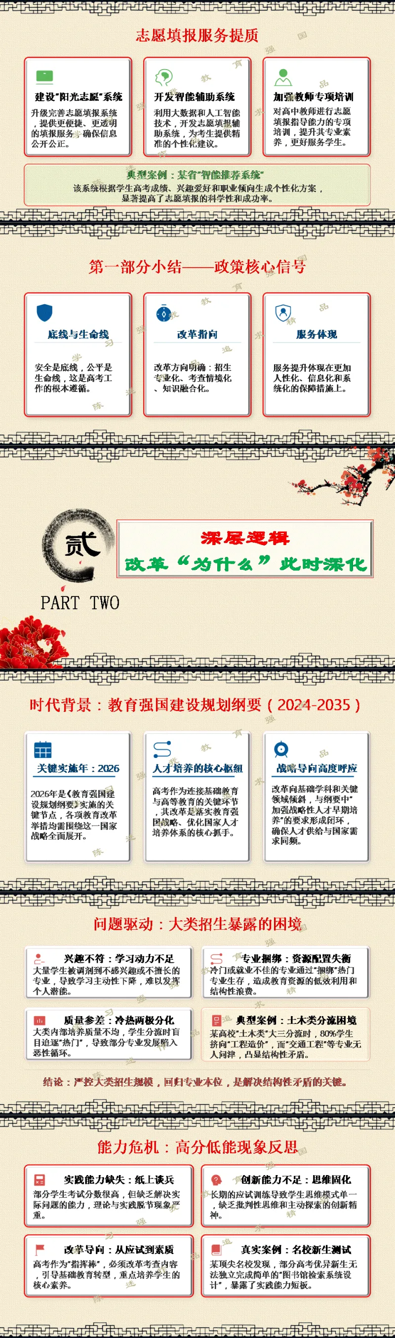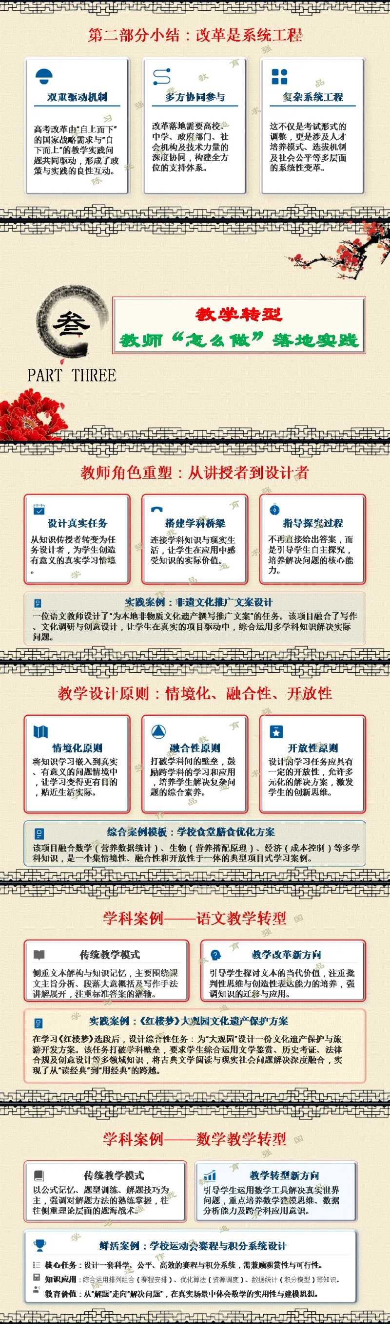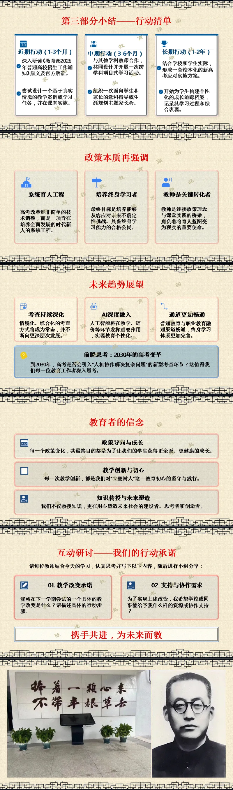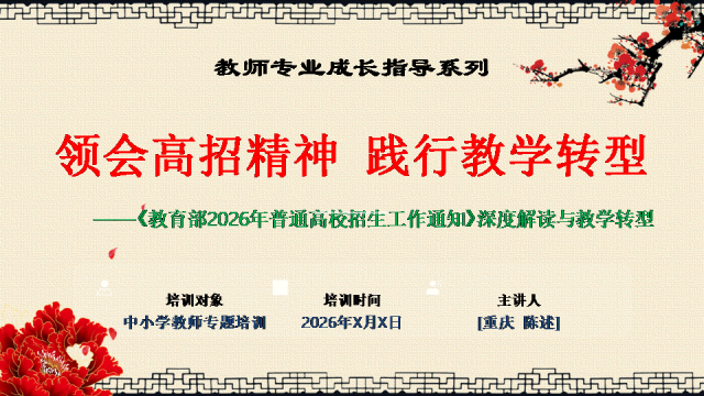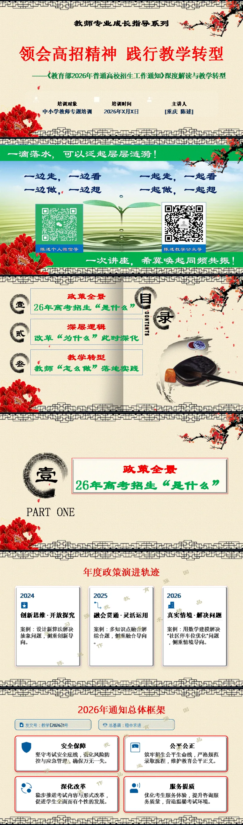 选择关注,关注陈述教学公众号,能力会提高。文末阅读一线校长更多原创内容。阅读提示:“政策年年读,今年大不同——这个课件把2026高考新政讲透了!”还在为枯燥的政策文件发愁?本课件,不讲空话,只给干货。✅ 59页精炼结构——从“是什么”到“为什么”再到“怎么做”,逻辑清晰,拿来就能讲✅ 30+鲜活案例——数学建模“停车位优化”、语文“非遗推广”、跨学科“雨水净化”……全是课堂上用得上的真实情境✅ 教师视角打磨——明白高校怎么招,主讲中小学怎么教、怎么学、怎么评✅ 适配各类培训——新学期全校教师培训大会、教研组研讨、高考改革专题培训、学科组集体备课,一页一页翻过去,老师们立刻认识教学确实需要转型、明天怎么上课