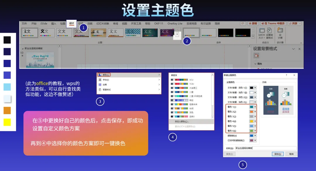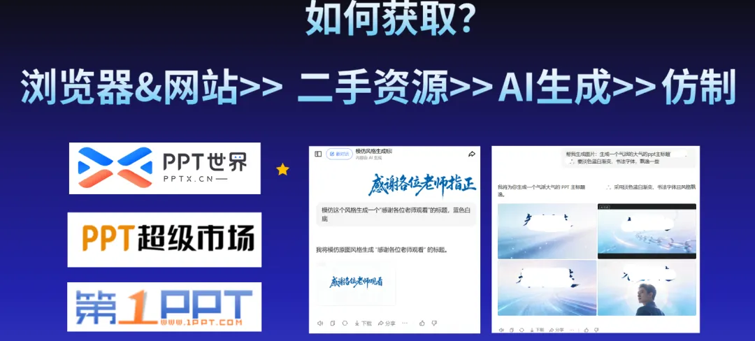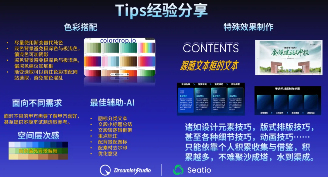 风格色调:风格一般直接根据内容,比如蓝白蓝黑的科技风,绿色的乡村振兴风格,金黄色金红色的非遗文化风等等。色调可以根据之前ppt或现成模板自定义,普遍来说暗色背景色调视觉上会优于浅色。