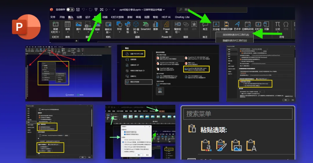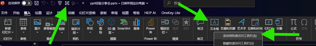 快速工具栏的使用,对任意选项卡右键即可调出,把个人常用的加在上方即可(例如文本框、选择窗格、形状)