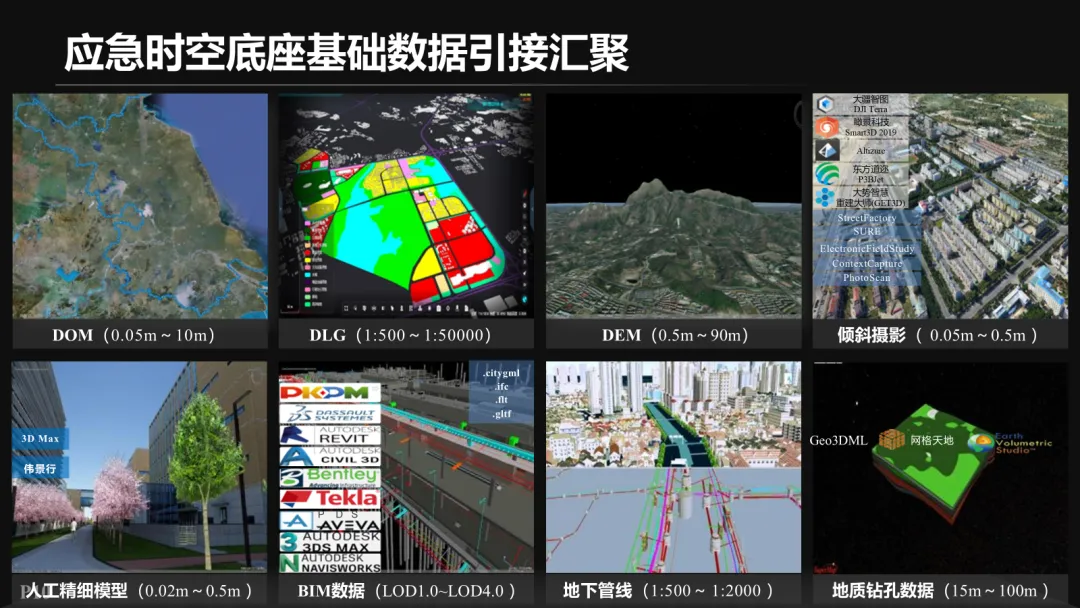 数据赋能是数字底座建设的基础,涵盖应急基础数据治理与应急专题数据治理两大板块。在基础数据治理方面,构建空天地协同的智能感知体系,整合遥感卫星、无人机、传感器等多源异构数据,通过统一时空基准、数据清洗、格式转换等技术,实现地理时空、感知监测等数据的高效汇聚与融合。重点突破三维数据处理、地表要素特征提取、动态数据融合等关键技术,利用 AI 算法实现建筑、地形等要素的智能识别与单体化建模,提升数据处理的自动化与精准度。在专题数据治理方面,汇聚地震、洪涝、危化安全等专题数据,构建以地理实体为基础的语义化管理体系,形成 “谱链码” 关联体系与多级应急服务体系。