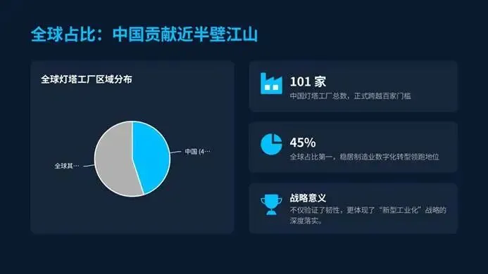 2025年中国制造业交出了一份亮眼的智造答卷,灯塔工厂数量正式突破101家,在全球224家灯塔工厂中占比高达45%,稳居世界第一。