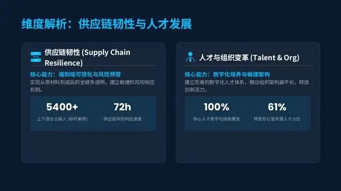 头部工厂更是实现5400+上下游企业接入、72小时供应链风险响应,核心人才数字化技能100%覆盖,让智造能力渗透到生产、供应链、人才管理的每一个环节。