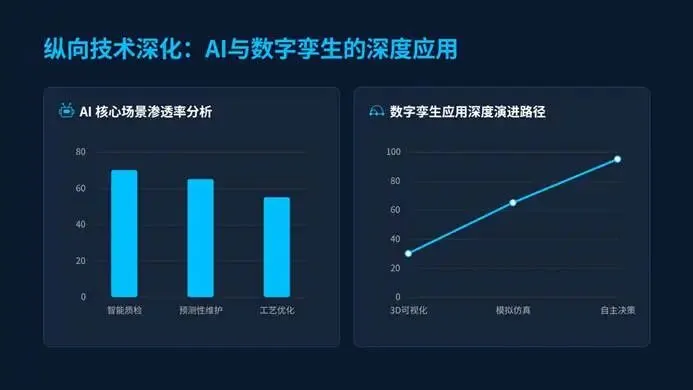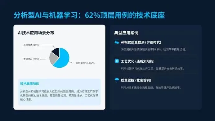 AI成为数字化转型的核心底座,近62%的顶层用例嵌入分析型AI与机器学习,覆盖智能质检、预测性维护、工艺优化三大核心场景。