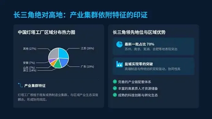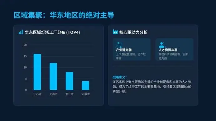 华东长三角凭借完善的产业链和丰富的人才,占据最新上榜工厂的70%,苏州、南京等地表现突出。而中西部也迎来智造升级机遇,宜宾宁德时代成为全球锂电首个可持续灯塔,重庆、荆门在新能源、生物医药领域快速突破,依托资源禀赋和政策支持,成为中国智造新增长极。