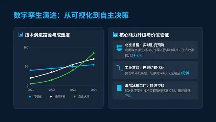 数字孪生则完成了从可视化到自主决策的升级,北京首钢用其模拟冷轧过程,生产效率提升21.2%;工业富联实现产线零停机换型,切换时间从7天压缩至1分钟;海尔冰箱工厂结合5G+数字孪生,损耗降低7%。