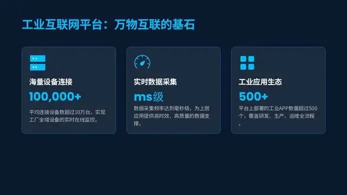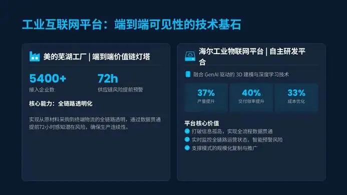 工业互联网更是成为万物互联的基石,平均连接设备超10万台,数据采集达毫秒级,美的芜湖工厂实现5400+企业接入、72小时风险预警,海尔工业互联网平台融合GenAI,实现产量提升37%、成本优化33%,让数据成为真正的生产要素。