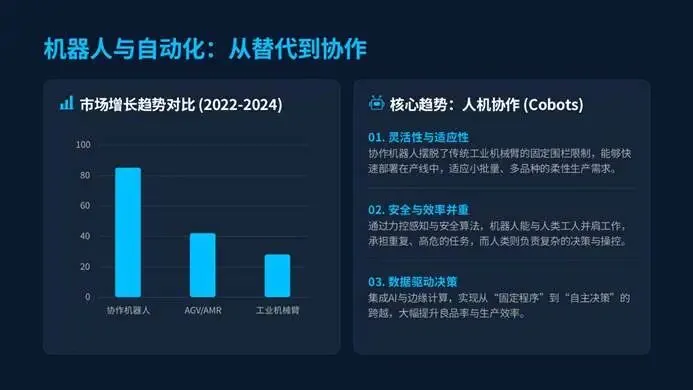 此外,5G+工业互联网、人机协作机器人的普及,让柔性生产成为常态,30%远程精准控制、25%机器视觉检测,突破了地域和场景限制,让制造业告别“大批量生产”,走向“按需生产”新范式。