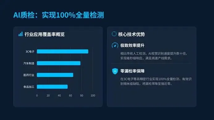 宁德时代AI质检缺陷识别率99.8%,检测效率提升10倍,通威太阳能靠机器学习优化工艺,大幅提升光电转换效率;AI更是在3C电子领域实现100%全量检测,将漏检率降至接近零。