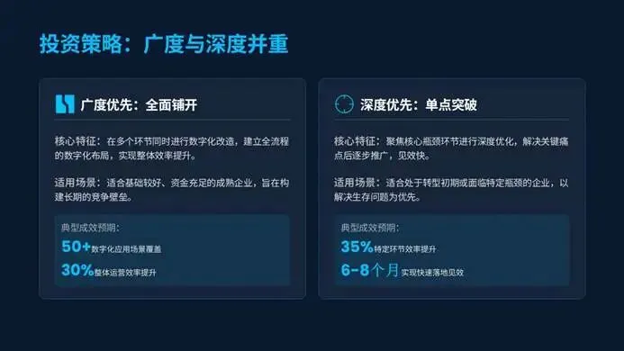 企业投资策略也愈发理性,“广度优先”适合成熟企业全面数字化改造,实现30%整体效率提升;