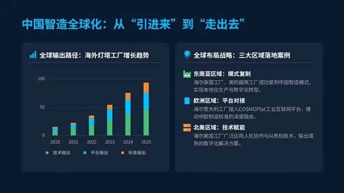 海尔、美的则将中国智造模式输出到东南亚、欧洲、北美,泰国、越南工厂复刻中国经验,意大利工厂对接工业互联网平台,中国的智造技术、平台和标准,正成为全球制造业转型的重要参考。