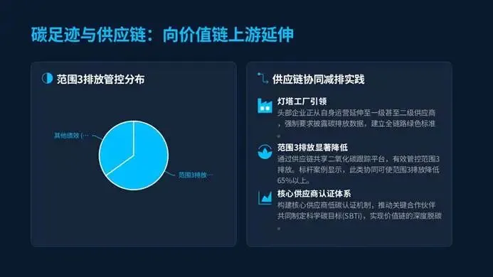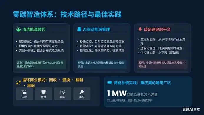 宁德时代宜宾工厂100%使用绿电,碳足迹降低56%,还带动13家核心供应商实现碳中和认证,重庆美的通用厂区分布式光伏发电量超230万kWh,1MW储能系统实现削峰填谷,法罗里奥实现皮革和金属残余料回收率100%,富士康观澜工厂用AI分拣工业垃圾,让循环经济成为智造标配。头部企业更是将减排延伸至供应链上游,管控范围3排放,构建低碳认证体系,让绿色制造从单一工厂延伸至全价值链。