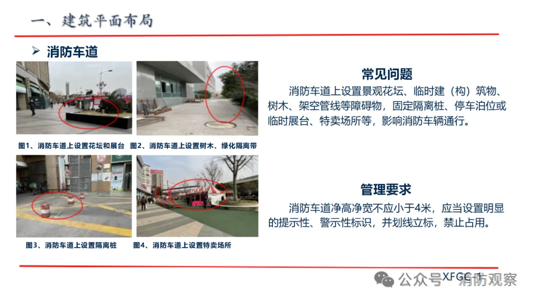 在我们的日常生活中,消防安全隐患无处不在,稍不注意就可能引发严重后果。例如,消防车道被占用是常见的问题之一,许多地方的消防车道上设置了景观花坛、临时建筑、树木、架空管线等障碍物,甚至被用作停车泊位或临时展台,严重影响消防车辆的通行。消防车道是火灾发生时救援车辆的“生命通道”,必须保持畅通无阻。根据管理要求,消防车道的净高和净宽均不应小于4米,并应设置明显的提示性标识,禁止任何占用行为。