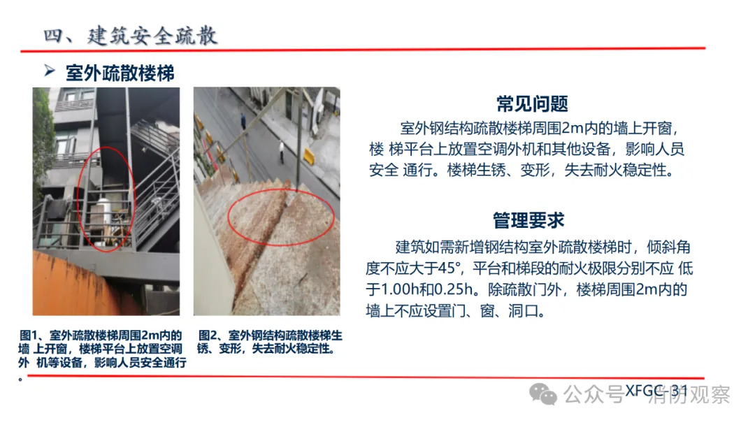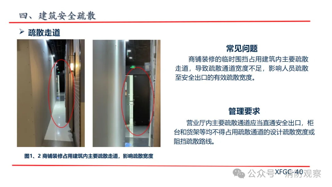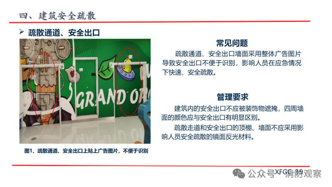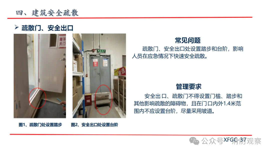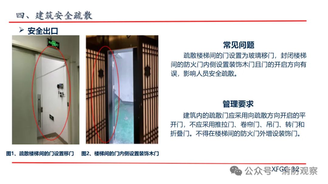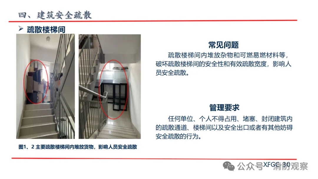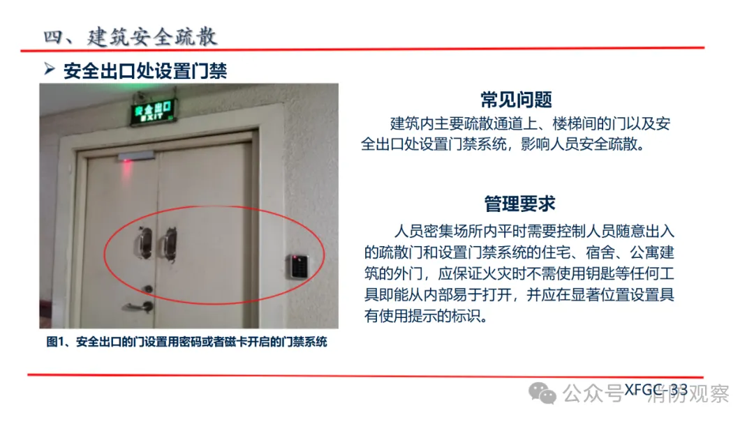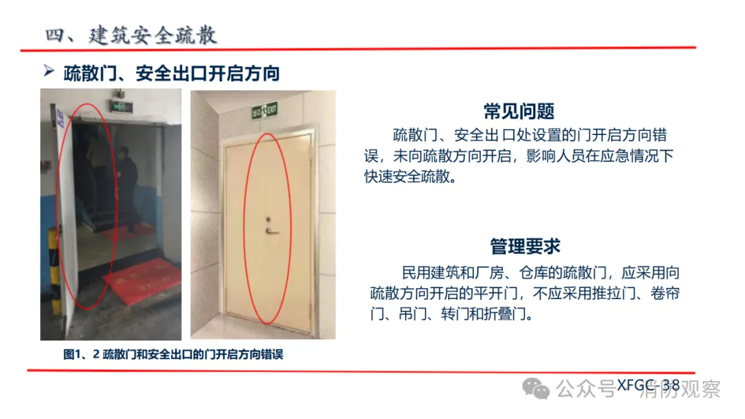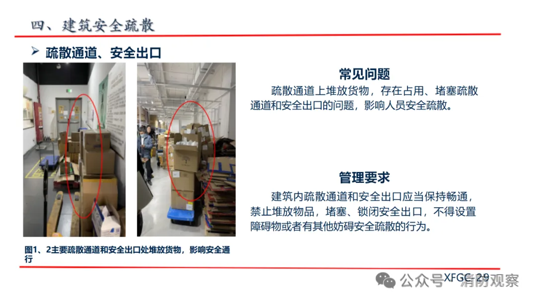 建筑内的疏散通道和安全出口也是消防安全的关键环节。然而,许多场所的疏散通道上常常堆放货物,安全出口被堵塞或锁闭,甚至设置了障碍物,严重影响人员的安全疏散。在火灾发生时,疏散通道和安全出口的畅通是保障人员生命安全的首要条件。因此,必须确保疏散通道和安全出口时刻保持畅通,不得堆放任何物品,且疏散门应向疏散方向开启,不得设置门槛或其他影响疏散的装置。