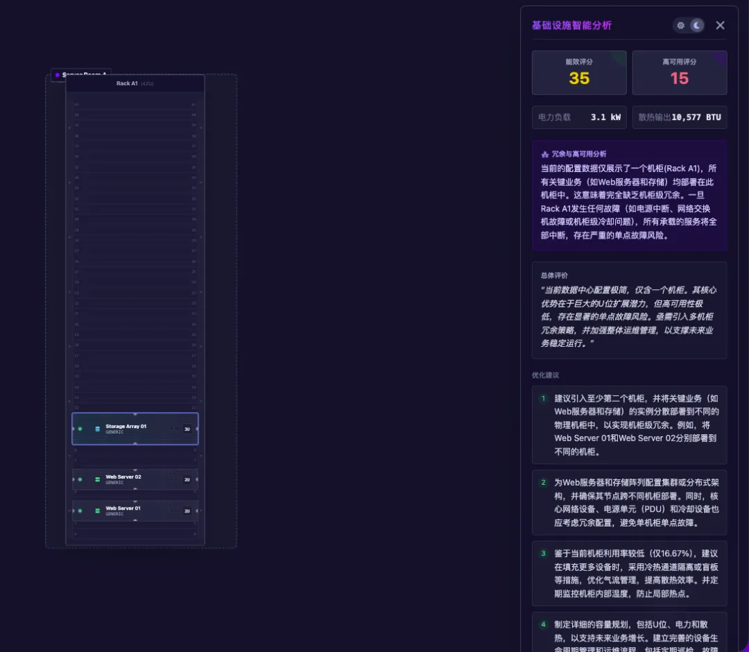 •4条具体优化建议(物理布局、冗余改进、能效优化、容量建议)