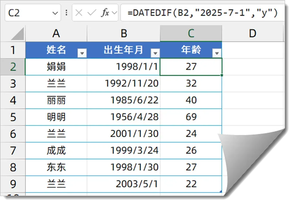 本例以C2的出生年月作为开始日期,以“2025-7-1”作为结束日期,第三参数使用“Y”,表示计算两个日期之间的整年数。