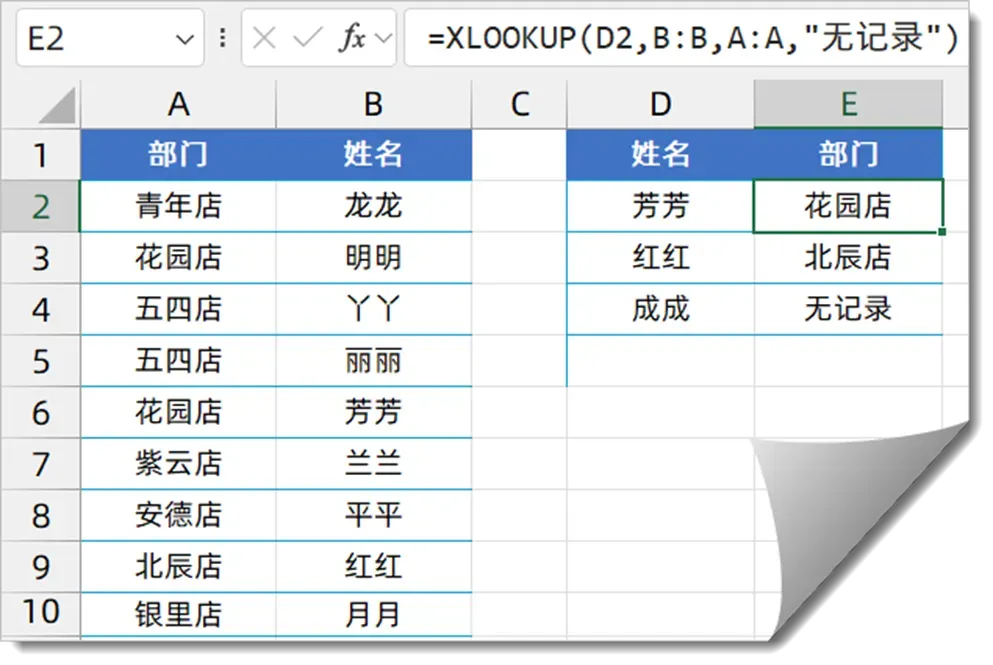 公式的意思就是在B列单元格区域中查找D2单元格的姓名,并返回A列单元格区域中与之对应的部门。如果找不到某个姓名,就返回“无记录”。