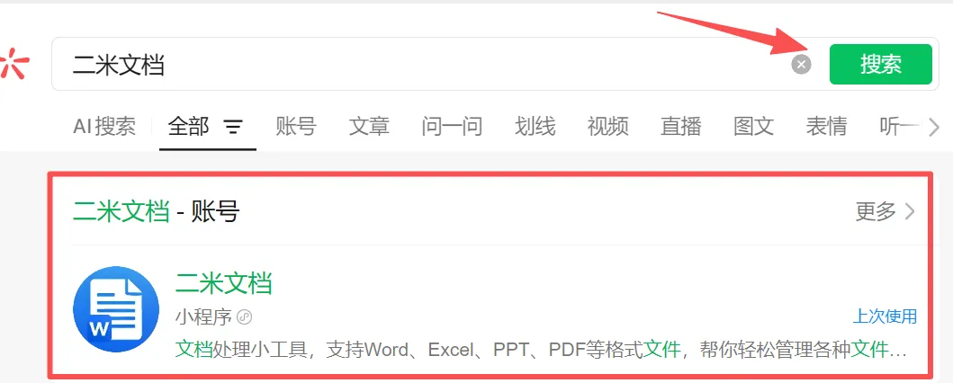 首先打开微信,搜索「二米文档」小程序并进入。
