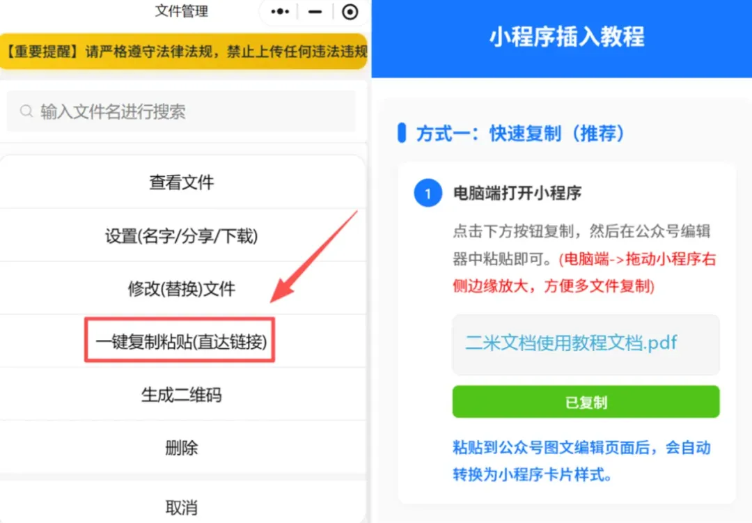 第二步:上传后会自动生成专属链接,点击对应文件,选择「一键复制粘贴(直达链接)」一会粘贴到公众号文章正文里。