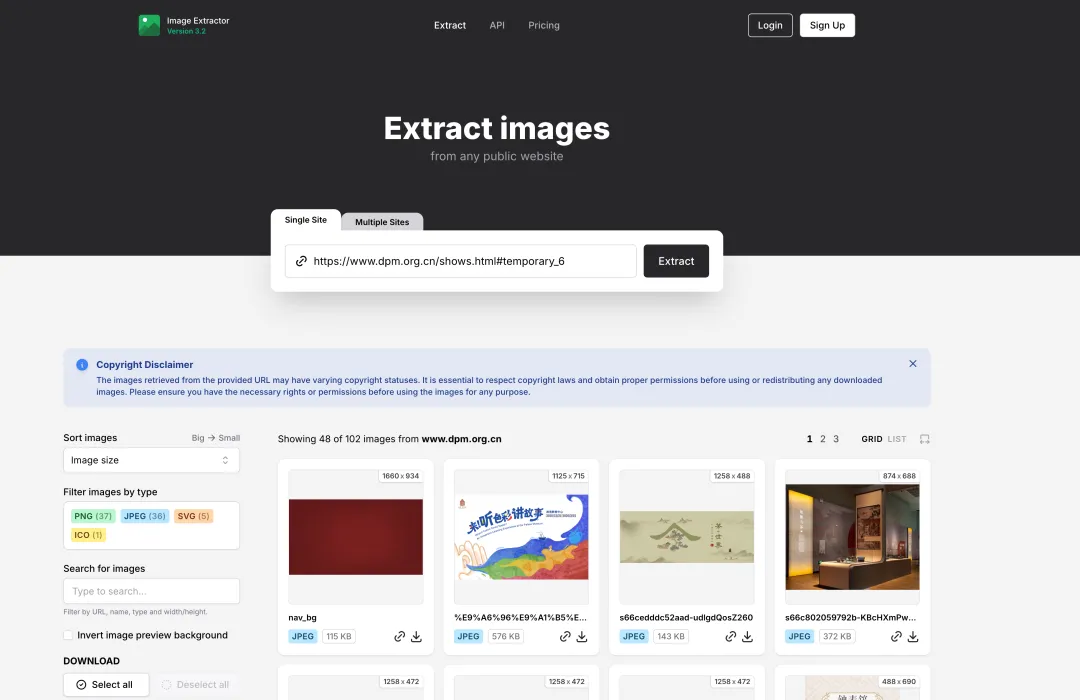 如果想把某个网站的图片一键下载下来,就可以直接把网址输入进去,点击“Extract”就全部下载下来了。