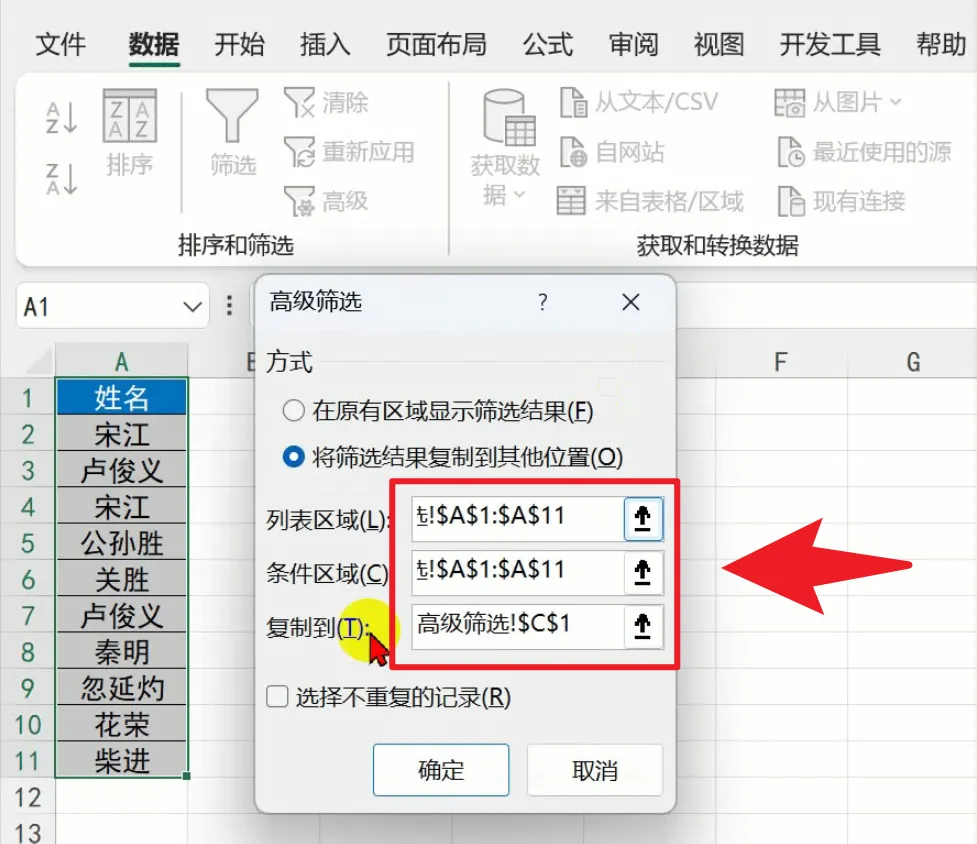 关键一步是勾选“选择不重复的记录”选项,点击确定后,不重复的数据便会被复制到新列中。这样,原列中的重复项便一目了然,便于进一步处理。
