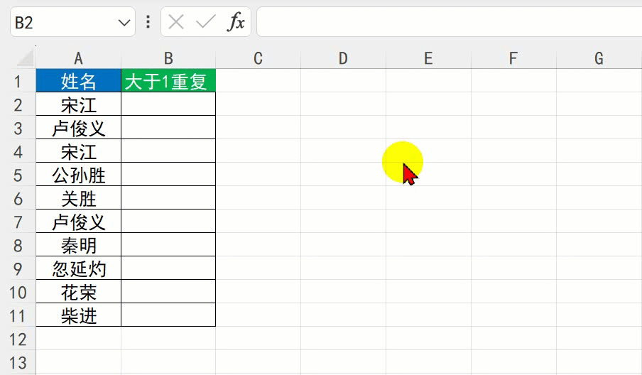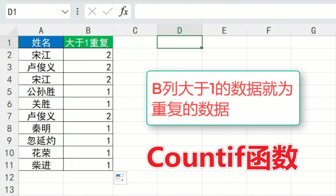 在处理大量数据时,上述方法可能略显繁琐。此时,COUNTIF函数便成为了间接识别重复项的好帮手。↓