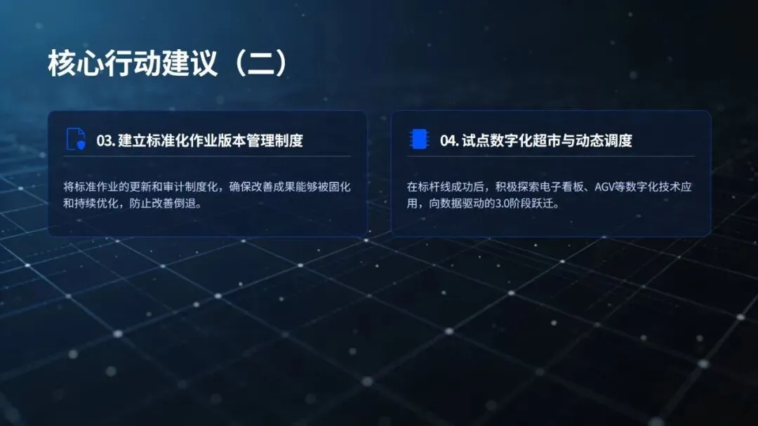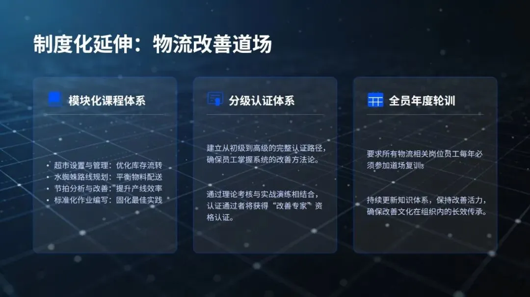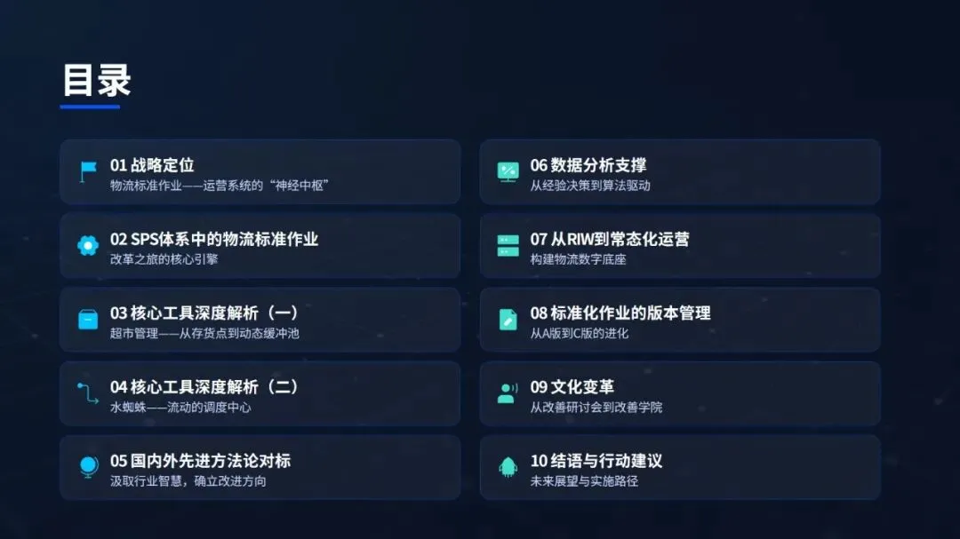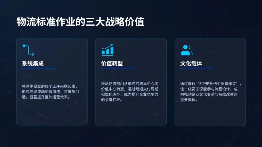 生产物流标准化作业是企业经营体系的中枢,其核心目的在于从根本上减少物流过程中的浪费,促进企业建立灵活的供应链,使物流由“搬运队”转变为准时生产活动的骨架,将生产过程中的各个环节串联起来,形成连续的价值流。物流标准化作业具有系统整合、价值转换和文化承载的战略价值,它不仅可以打破部门间的界限,提高运作效率,使物流由成本中心转变为价值中心,还可以通过将一线员工的参与转化为流程改进的动力,使其成为企业不断创新的重要工具。