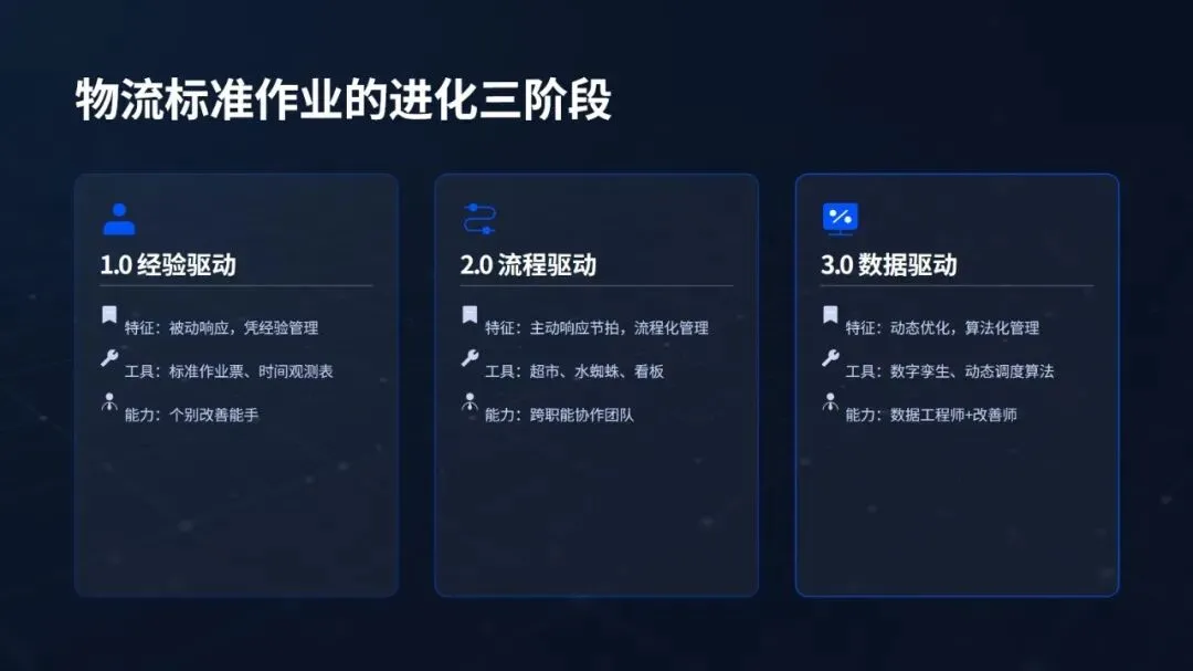 物流标准化作业经历了经验驱动、过程驱动和数据驱动的三个发展阶段,企业可以在标准作业覆盖、超市式管理等五维成熟度评价模式的指导下进行自我诊断,并在此基础上逐步实施标准化作业标杆建设、数据资产积累、数字化调度试点等措施,以数字化、智能化为手段,实现物流企业从单个环节的优化提升到整个供应链的协同增效,从而提升自身的核心竞争力。