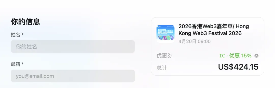 作为 2026 香港 Web3 嘉年华的官方社区合作伙伴,IC 中文社区为大家提供 85 折专属门票优惠,优惠码:IC。
