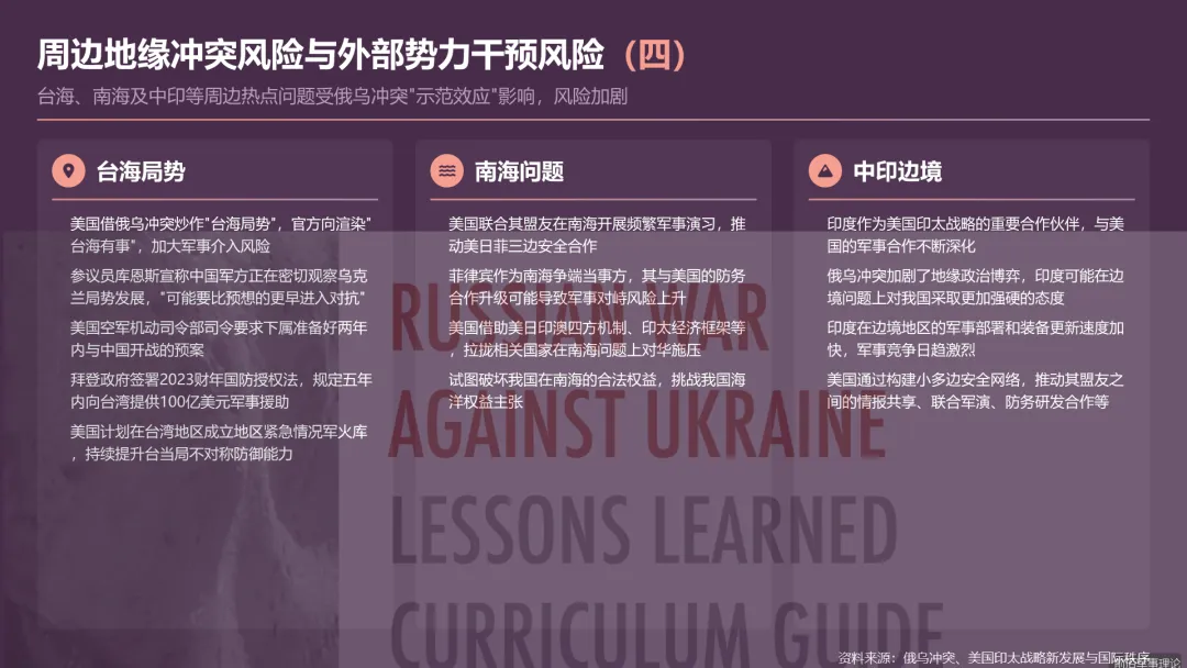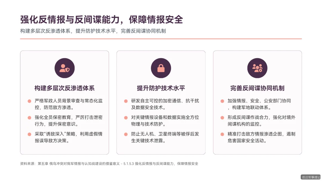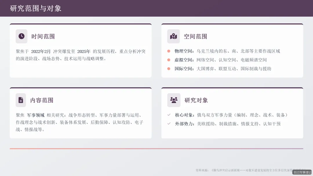 第三部分(约 60 页):战略思考与应对路径。本部分将聚焦于我国周边安全态势的新变化与新挑战,结合俄乌冲突的经验,系统提出我军在装备体系优化、作战能力提升、人才培养、战略布局、后勤保障以及情报认知战能力建设等方面的综合应对路径。最后,对研究进行总结,归纳核心借鉴要点,并对未来相关研究方向进行展望,形成完整的战略闭环,为决策者提供清晰、全面的战略参考。