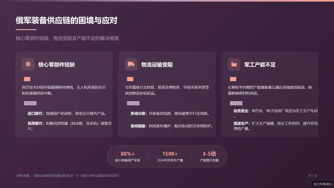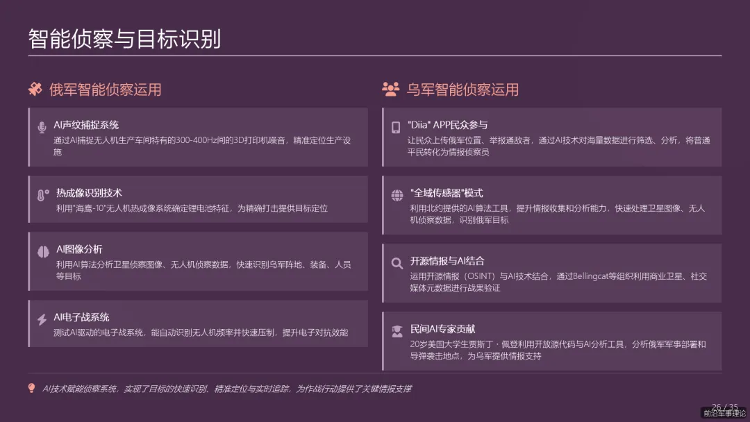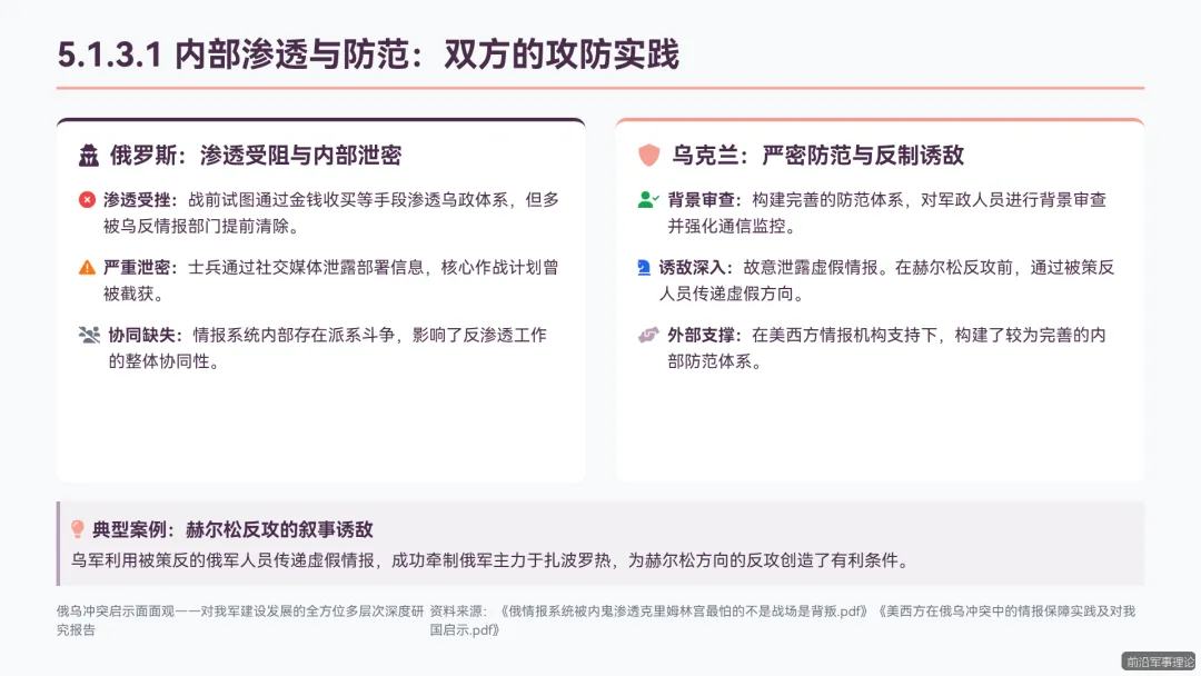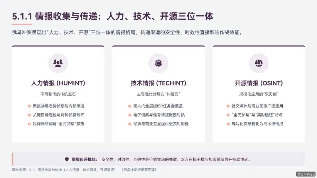 俄乌冲突所暴露的现代战争新规律、新特点、新趋势,为我军应对未来安全威胁、推进国防和军队现代化建设提供了宝贵的现实样本。系统研究这场冲突的演进逻辑、战场特征与作战实践,对于我军把握战争形态发展脉搏、提升打赢未来信息化智能化战争能力具有紧迫的现实必要性和深远的战略意义。本280页PPT报告旨在通过对俄乌冲突的全方位、多层次深度剖析,提炼其对我军在信息化建设、无人系统发展、情报认知战、装备后勤保障、人才部队建设以及地缘战略布局等方面的核心启示,为我军的现代化转型提供坚实的理论支撑与实践路径。