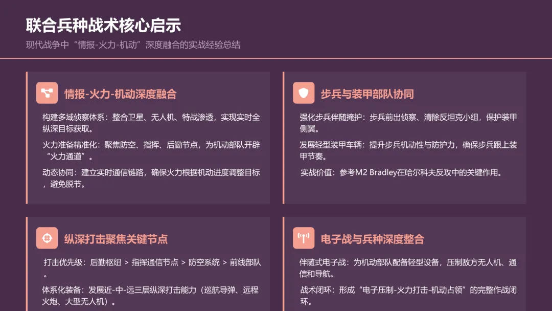 第四部分(约 20 页):附录与数据支撑。为增强报告的严谨性和说服力,PPT 将包含核心战例汇总、双方装备与兵力部署统计、关键装备实战运用数据表等附录内容,作为正文分析的坚实数据支撑,确保每一个结论都有据可依。