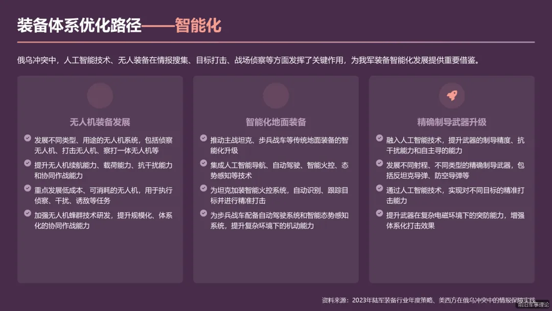 第二部分(约 160 页):分域深度解析与借鉴。这是 PPT 的核心主体,将严格遵循您提供的章节结构,逐一对各领域的经验教训与借鉴意义进行可视化呈现。从信息化与智能化作战、无人机作战体系、情报与认知战、装备建设与发展,到战略战术与后勤保障、人才培养与部队建设、地缘战略与能源安全,每个章节都将通过丰富的案例、数据图表和逻辑分析,提炼出对我军建设最具价值的具体启示与行动建议,确保内容的专业性、针对性和实践指导性。