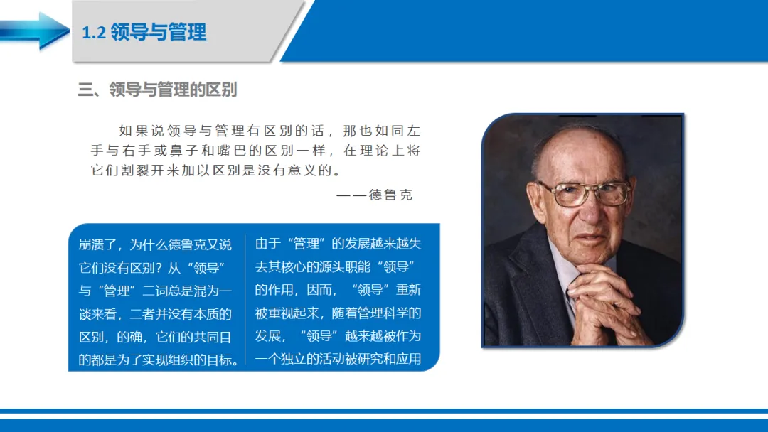 "如果说领导与管理有区别的话,那也如同左手与右手或鼻子和嘴巴的区别一样,在理论上将它们割裂开来加以区别是没有意义的。"