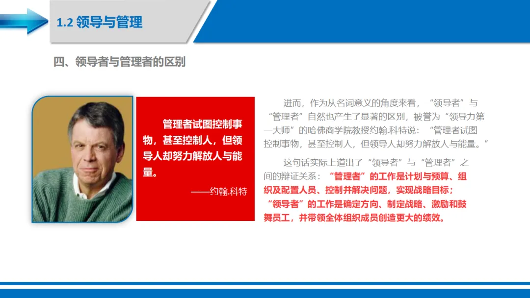 领导侧重于"人"和"方向",管理侧重于"事"和"效率"。